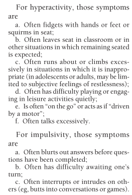 Here are diagnostic criteria for hyperactivity and impulsivity in ADHD1: