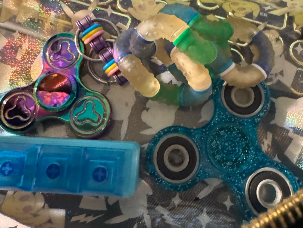A little while back, I started looking around to make a kit of stim tools that I could use to help me sit through long meetings and lectures. Although the combination I’ve settled on (for now) isn’t perfect, I thought it might be helpful to share what I’ve learned and what I’m doing right now.