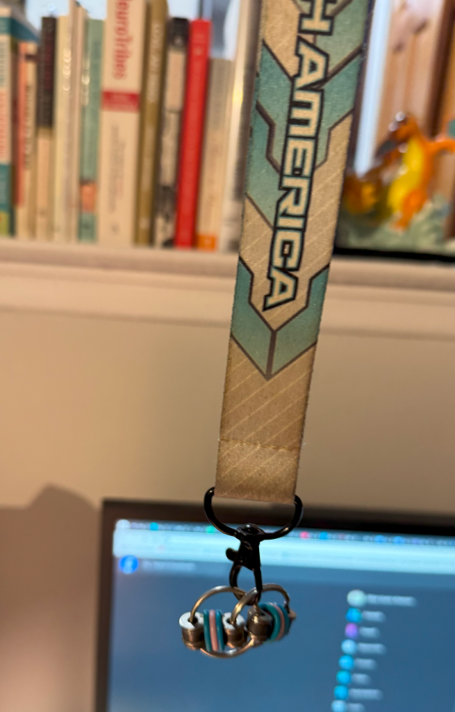 I made this out of a lanyard (this one is from the Pokémon North American International Championships a few years ago) and a bike chain keyring fidget. This is often my go-to stim tool as I wear it around my neck and don’t have to fumble around in my bag for it. It’s also pretty cheap; there are multiple Etsy listings for $5 plus shipping (like this one) and even listings for fun pride-themed colorways which I might just buy right now! Be right back! (By the way, I have no affiliation with any of the products I may link to in this article, nor am I receiving any compensation for including them.) Anyway, these little fidgets are silent, small, and I think they make a particularly satisfying stim for people who may be prone to skin picking. And you can use any lanyard your heart desires!
