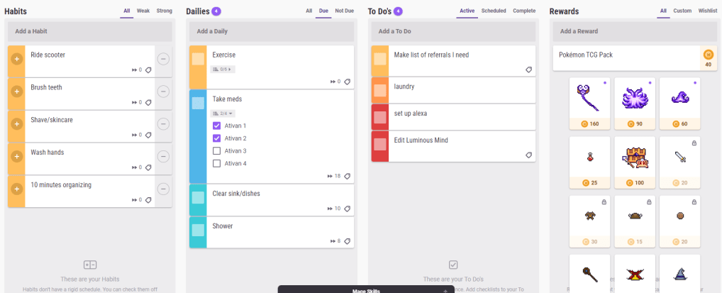 It seems like everyone’s got their own favorite app for managing daily tasks and to-dos, but so far my favorite is Habitica. I think it could be really useful for neurodivergent people with the right personality — Habitica is very much a “menus” game. If you love fine-tuning and deep personalization, Habitica could be perfect for you.